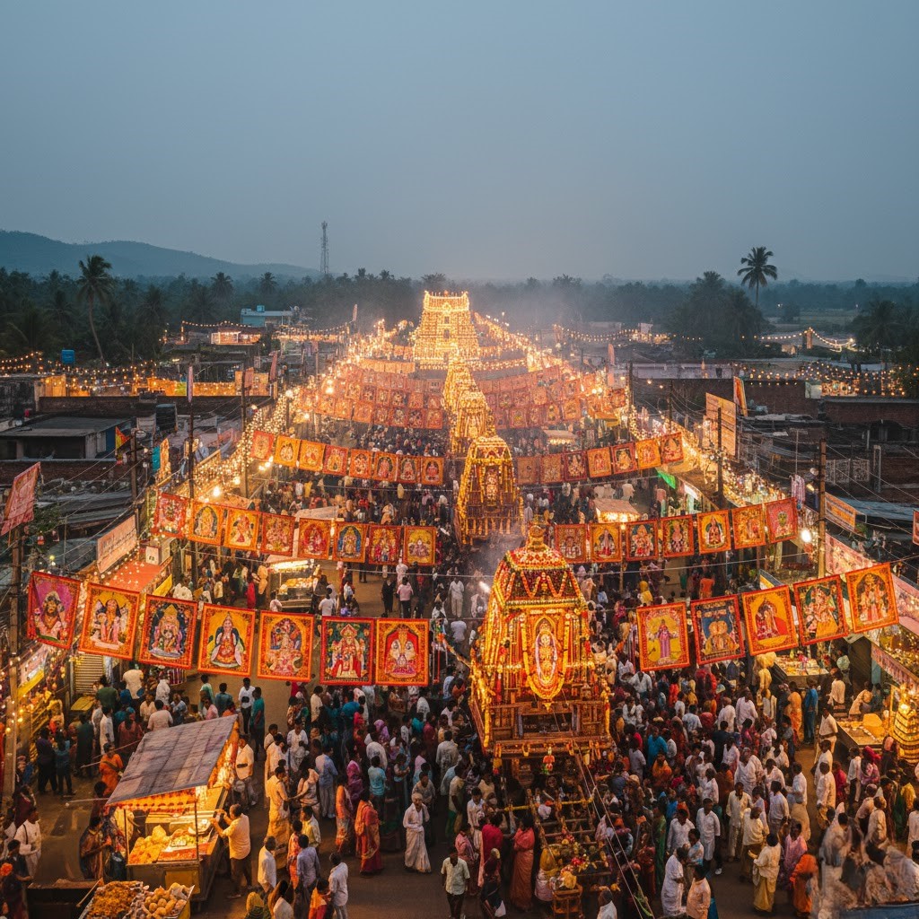 Kadiri Lakshmi Narasimha Swamy Brahmotsavam – The Divine Chariot Festival of Faith The Sri Lakshmi Narasimha Swamy Brahmotsavam is one of the grandest temple festivals celebrated in Kadiri, a historic town in the Anantapur district. Dedicated to Lord Narasimha, an incarnation of Lord Vishnu, this sacred festival is held every year in the renowned Sri Lakshmi Narasimha Swamy Temple, one of the oldest and most revered shrines in South India. The Brahmotsavam, which usually takes place in March or April (Phalguna Masam), spans over 11 days and attracts thousands of devotees from across Andhra Pradesh and Karnataka. The celebration is a blend of spiritual grandeur, cultural heritage, and local devotion, making it one of Anantapur’s most spectacular religious events. 🛕 The Temple and Its Legacy The Sri Lakshmi Narasimha Swamy Temple in Kadiri is a site of immense mythological and historical importance. It is believed that Lord Vishnu appeared here as Narasimha Swamy after killing the demon Hiranyakashipu, and that the sacred idol of the deity still sweats and radiates divine heat, symbolizing his eternal presence. The temple’s architecture, adorned with intricate carvings and tall gopurams, represents the splendor of ancient South Indian craftsmanship. The Brahmotsavam is a way for devotees to honor this divine power and relive the mythological glory associated with the temple. 🎊 The Brahmotsavam Festivities The Kadiri Brahmotsavam is a vibrant and devotional event that fills the temple town with chants, music, and faith. Each day of the festival has its own sacred rituals and colorful processions. Major Highlights Include: Dwajarohanam: The ceremonial flag hoisting that marks the beginning of the Brahmotsavam. Rathotsavam (Temple Car Procession): The most awaited event where the idol of Lord Narasimha is taken through the streets of Kadiri on a beautifully decorated wooden chariot pulled by devotees. Kalyanotsavam: The divine celestial wedding of Lord Narasimha and Goddess Lakshmi, performed with grandeur and devotion. Abhishekams and Alankarams: Daily rituals where the deity is bathed, decorated, and adorned with flowers, gold ornaments, and silk garments. Cultural Programs: In the evenings, devotional music, classical dance performances, and spiritual discourses are held in the temple courtyard. Theerthavari (Holy Bath): On the concluding day, the temple flag is lowered and a holy bath is performed for the deities, signifying the completion of the Brahmotsavam. Throughout these days, Kadiri is transformed into a divine city — the sound of temple bells, devotional hymns, and conch shells echo through the air, creating a deeply spiritual atmosphere. 🌿 Spiritual and Cultural Significance The Kadiri Brahmotsavam represents the triumph of faith, the continuation of ancient temple traditions, and the spirit of unity in the community. Devotees from all over the region participate in voluntary service — from organizing annadanam (free meals) to decorating the temple streets. This festival not only strengthens religious faith but also highlights the cultural vibrancy of the Rayalaseema region, preserving centuries-old rituals that continue to inspire generations. 🕕 Festival Details Location: Sri Lakshmi Narasimha Swamy Temple, Kadiri, Anantapur District, Andhra Pradesh Deity: Lord Lakshmi Narasimha Swamy Duration: 11 Days (March–April) Main Events: Dwajarohanam, Kalyanotsavam, Rathotsavam, Theerthavari Entry: Free for all devotees Nearest Railway Station: Kadiri Railway Station (1 km) Organized By: Temple Committee and Andhra Pradesh Endowments Department ✨ Why You Should Visit The Kadiri Lakshmi Narasimha Swamy Brahmotsavam offers one of the most divine and visually stunning experiences in Anantapur district. Watching the grand chariot glide through the temple streets surrounded by chanting devotees is a sight that fills the heart with faith and wonder. Whether you visit as a pilgrim or a traveler, this festival captures the essence of devotion, art, and tradition that makes Kadiri a spiritual cornerstone of Anantapur.